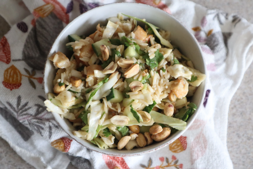 Base of brown rice or quinoa, top with crispy chickpeas (pan-fry ’em quick) or sliced chicken, shredded cabbage/carrot slaw, cucumber. Sauce: peanut butter thinned with soy sauce, lime, little water-drizzle heavy. Crushed peanuts on top for crunch. Creamy, addictive, and the combo of protein/fats/fiber sustains you forever. Kids devour it too.