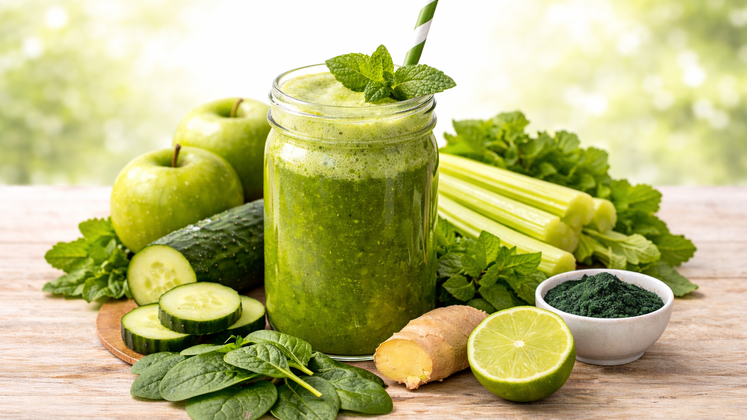High in chlorophyll, vitamins A/C/K, and antioxidants from greens like spinach/kale/cucumber. It supports detoxification (flushing toxins via better liver/kidney function), reduces inflammation, boosts hydration for plump skin, and provides steady energy from iron/B vitamins without crashes. Over time, it can lead to clearer, more even-toned skin and improved vitality.