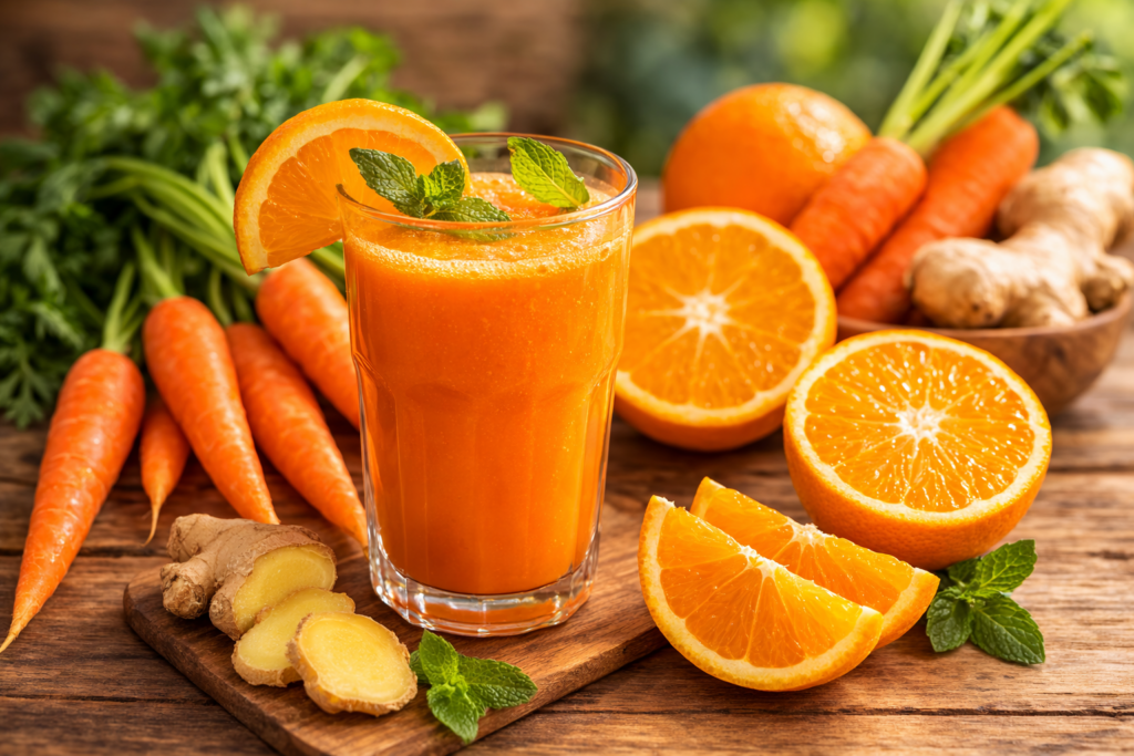 Instructions: Wash and chop carrots (no need to peel if organic). Juice oranges first for liquid base, then carrots and ginger. Mix well and drink immediately for max brightness.