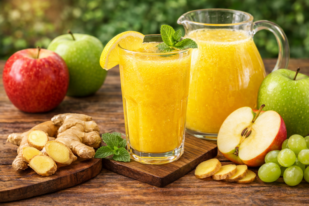 Apples offer flavonoids for gentle detox and steady energy , ginger reduces bloating/inflammation, boosts digestion/circulation, and supports immunity. Together, they promote clearer skin (less redness/bloating-related dullness), brighter tone, and focused morning energy.